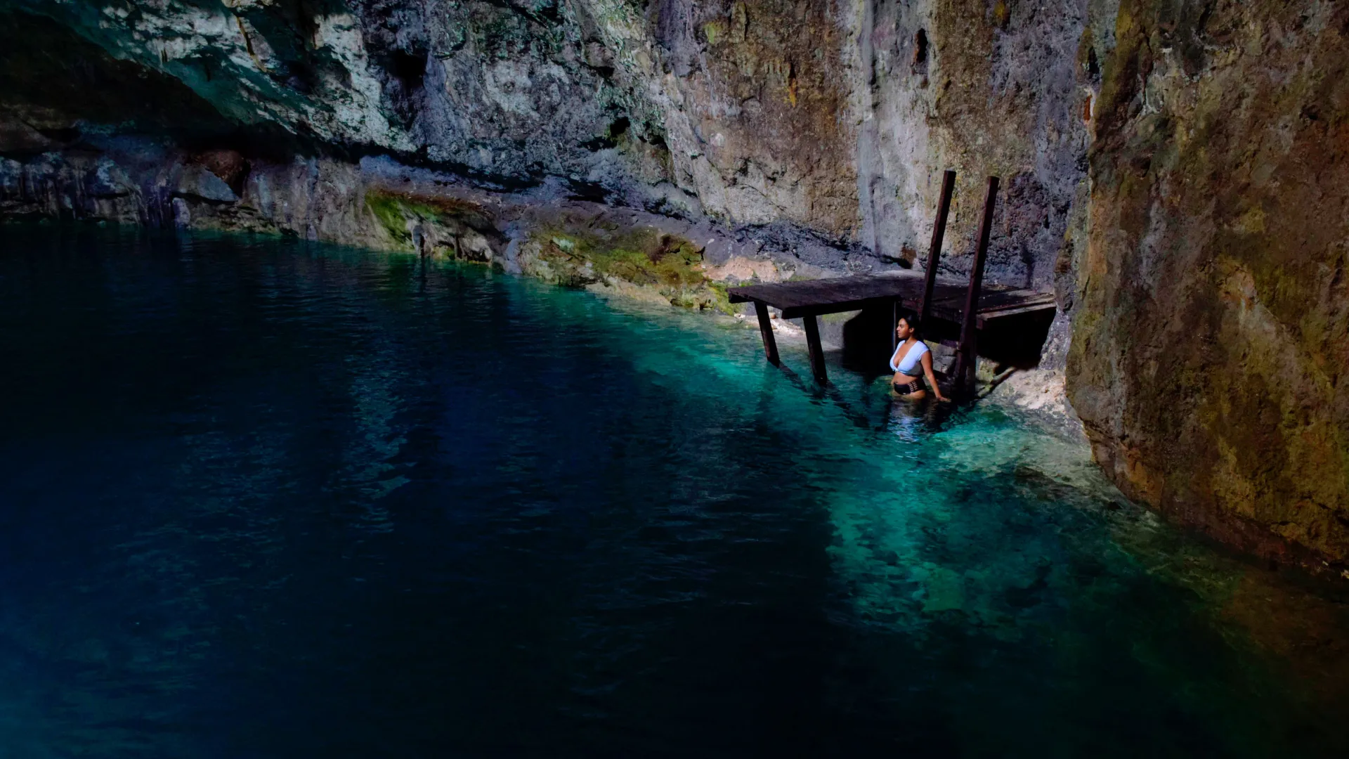 The final stop reaches Cenote Xux-Ha, a hidden jungle cenote where stalactites hang from the ceiling, tree roots penetrate the limestone, and crystal-clear water reflects the natural formations in near-perfect stillness.